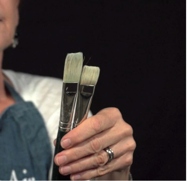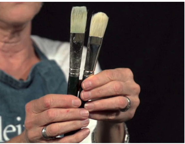 “By just turning them a little bit, you can achieve almost everything you need,” she says. The difference is that the flat is almost twice as long as the bright. “The flat will hold a lot more paint,” says Daniel. “So when you’re going to mix paint and you’re loading up your brush, you’re going to find that the flat just carries a whole lot more paint than the bright will.”