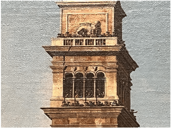 And here’s a closeup of the belltower (below). Not only are spectators crowding the upper baluastrade and leaning over the stone edge of the next landing, but they’re also visible in the interior of the tower – Canelleto even painted them several layers deep.