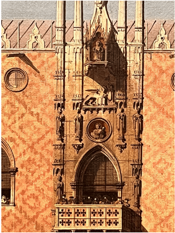 The title refers to the doge’s ceremonial boat by name: “The Bucintoro on Ascension Day, Docked in Front of the Doge’s Palace.” Once a year on Ascension Day, the doge and other officials boarded this vessel to participate in a ritual celebrating the symbolic marriage of Venice and the sea. The ship was destroyed in 1798 on Napoleon’s orders to consummate his victory in conquering the city. It was a very special vessel, decked in royal red and gold filigree.