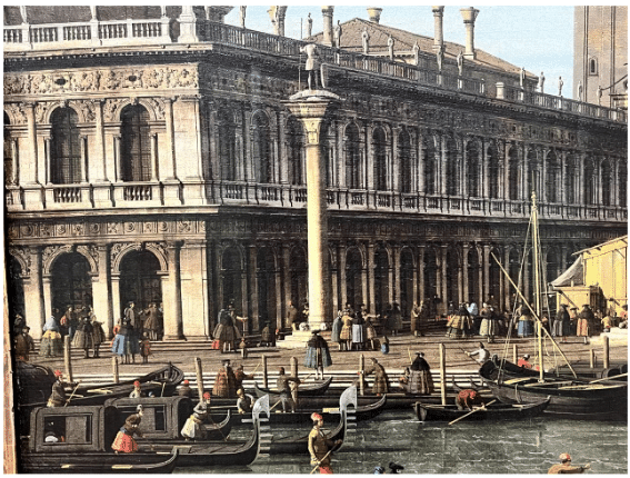 Although this painting isn’t dated, we know when Canaletto painted it becausse of how he rendered the clock tower of St. Mark’s. The tower has a jagged edge (see pic below) because it was struck by lighting in 1745. Caneletto was an observational painter par excelece.