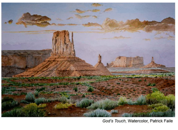 For my painting “God’s Touch” I used a violet mixture to use at the horizon line to embellish the sky by giving it a sense of distant clouds in the impending nightfall. Same is true with the foliage in this painting as I used brighter greens and yellows in some foliage over and above what you would find in the desert. Not all the way through the painting but at strategic areas to add interest and move the viewer’s eye.
