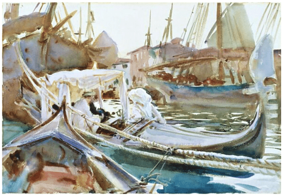 The form fits the content. It’s not just a gondola or the people in it but the lively jostle of the harbor that inspires Sargent, so he channels that sensation (if it had a name, it would be something like “energetic entanglement”) into a cluster of angular, dynamically opposed, yet fluidly connected shapes and lines. Sargent firmly places the moment’s lively, semi-chaotic physical properties fully at the service of the overall feeling expressed: the jostling boats, with their counterpoised rigging, prows, and sails, the gondolas’ sweeping shapes, the marching masts’ verticals vs. the curvilinear ropes and the gondola’s curvaceous horizontality… together with the arabesques of light and shadow on the water, it all conveys liveliness and energy.