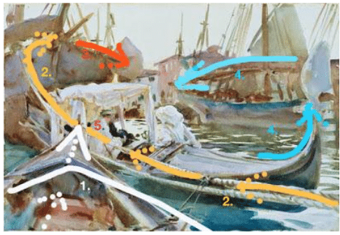At 1 or 2, the bottom of the canvas, the eye enters the painting and jumps toward the center cluster of connected shapes via the strongly directional prow of the boat on the lower left. Much of the painting’s immediacy and excitement come from the way “our” boat’s prow is jutting up from the viewer’s space into the picture plane – a hallmark of Italian Baroque painting.