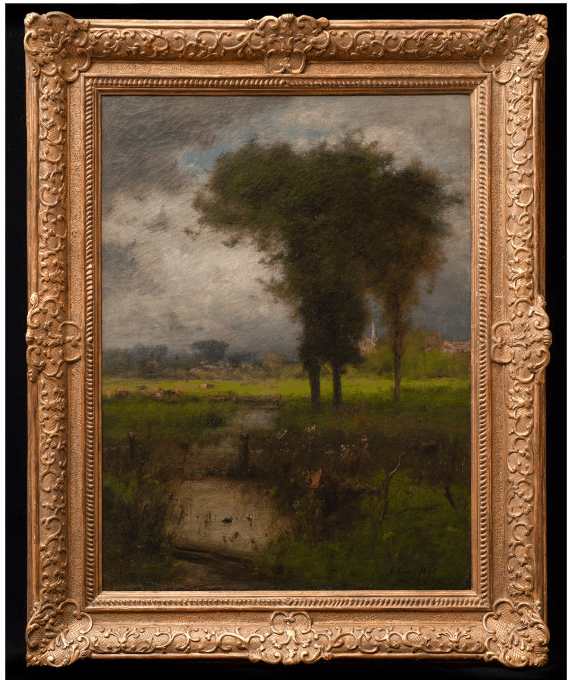 Although clearly a studio painting, this work contains the grayed color Inness sought in his plein-air landscapes done while the artist was in Milton, Massachusetts and Montclair, New Jersey in the 1880s. The forms are created by numerous layers of thin color applied with a variety of touch, seen clearly in the large elm trees. Due to its remarkable state of preservation, the painting has retained the extremely subtle adjustments of light, color and texture that capture the effect of a landscape recently drenched by a thunderstorm, now clearing off. Despite the presence of ‘Montclair’ in the title of this and many other works from the period, the locations depicted are generally unknown. Instead, they offer spaces for contemplation and reflection, an idea captured in one of his key remarks from the 1880s: