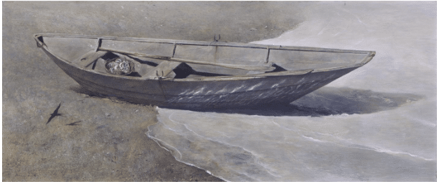 To the left of the hull we glimpse the silhouette of a swallow in flight, providing a counterpoint of motion to the stationery dory. It seems a minor detail, but in fact the whole painting presents a balance between motion and stillness. The stationary/in motion dichotomy is apropos of a temporarily abandoned object whose owner is absent yet present in the object itself, and soon to return at that. Wyeth makes sure we see the bird’s shadow as it skims across the minutely textured sand.