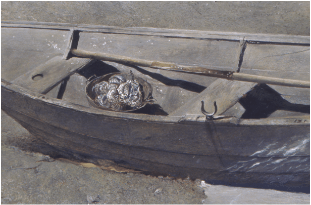 Half in and half out of the water, housing a bucket of freshly harvested bait fish, the boat has the feeling of being left momentarily. Hard use has battered the oars, the sea and weather have worn the boat’s paint off, and years of oarlock rust have stained the boards.