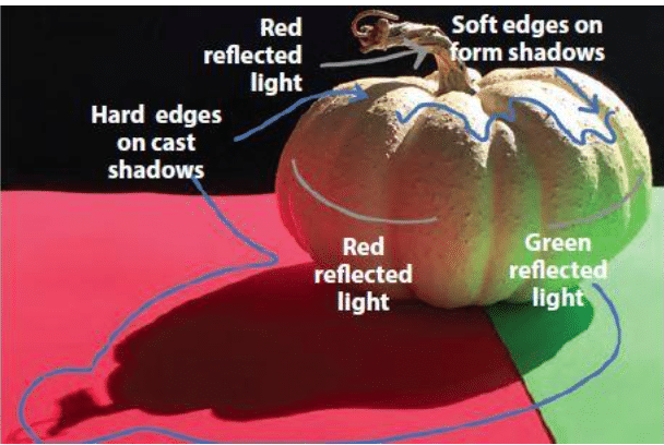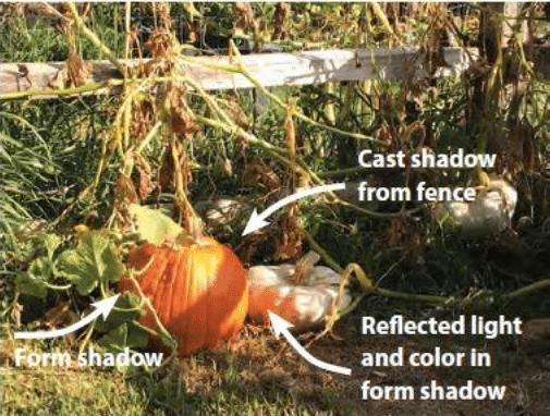 The illuminated area near an object reflects, or bounces, light into the shadows and carries color with it — this is called “reflected light.” The orange pumpkin on the left has form and cast shadows. In case you missed it, see Brenda’s free lesson on negative painting, in which she uses this reference photo.