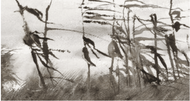 They lean into the punishing wind, which resists them and whips back their withered leaves. There’s a division, on either side of the exact middle of the canvas, of the larger group on the right and the two stalks separated out on the left. That separation reinforces the sense of isolation the arrangement conveys.