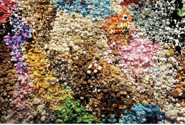 Canadian artist Claude Cormier makes “paintings” with stuffed animals. From across the room, Cormier’s work Stuffed Animals at the Montreal Museum of Fine Art reads like a colorful abstraction. Get closer and you realize it’s plushies – 3,000 of them to be precise.