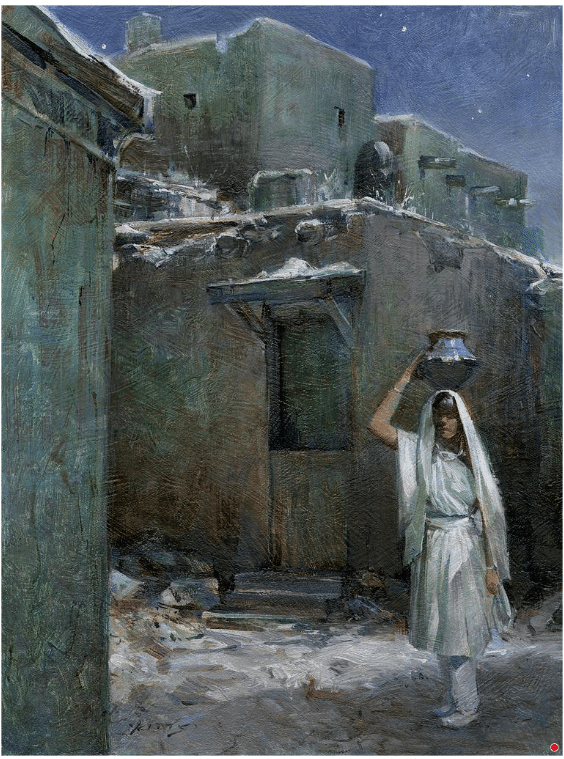 Thomas Jefferson Kitts, Carrying Water, by Moonlight, an Historical Pueblo Scene, oil on panel, 12×12 in. Thomas Jefferson Kitts teaches his oil-painting process via his love and admiration for the techniques of 20th century master realist Joaquín Sorolla. Check out his video here.