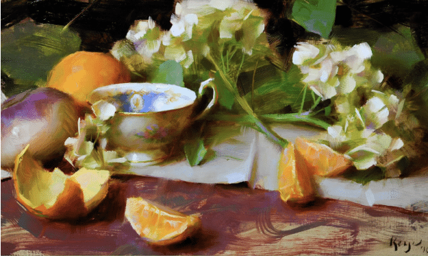 Daniel Keys, “Hydrangeas and Oranges,” oil. Daniel Keys breaks down the technique behind this painting in a professional step-by-step video titled