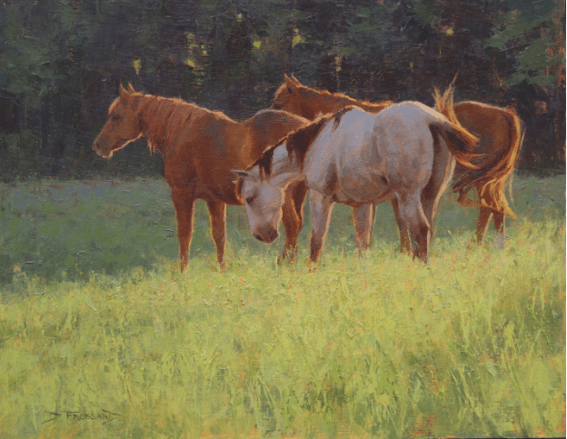 Diane Frossard took the Bronze for “The Broodmares,” her luminous painting of three horses gilded by warm, slanting sunlight. Broodmares are female horses of strong stock kept for breeding healthy foals.