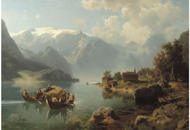 August Wilhelm Leu, (German, 1819-1897), “A Cheerful Encounter on an Alpine Lake,” 1862