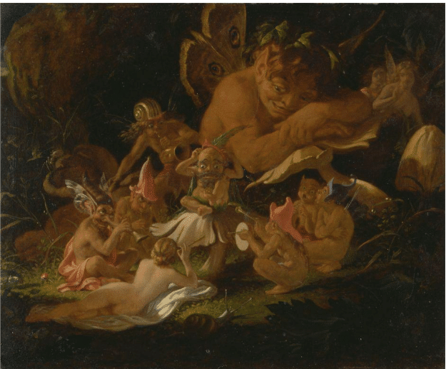 Joseph Noel Paton’s Puck and Fairies, from “A Midsummer Night’s Dream” from about 1850, (immediately above) pictures a group of grotesque figures beneath a large toadstool, with a nude fairy piper reclining in the foreground and a paler nude fairy with wings in the background. In this scene, mischievous fairies blast a grimacing victim with cacophonous music and noise while a sleepy yet amused Puck looks on.