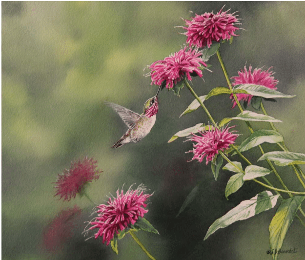 “Calliope Hummingbird in Bee Balm” Original Watercolor Image size is 13-1/2” x14-1/2”