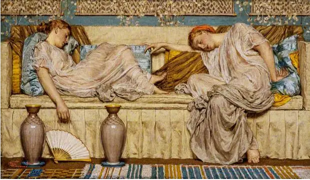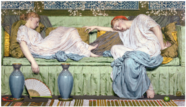 Albert Joseph Moore, “A Sofa,” ca. 1875, Oil on canvas, 11.5 x 20 in. (29 x 51 cm.). Yale Center for British Art, Paul Mellon Fund, B1982.10.