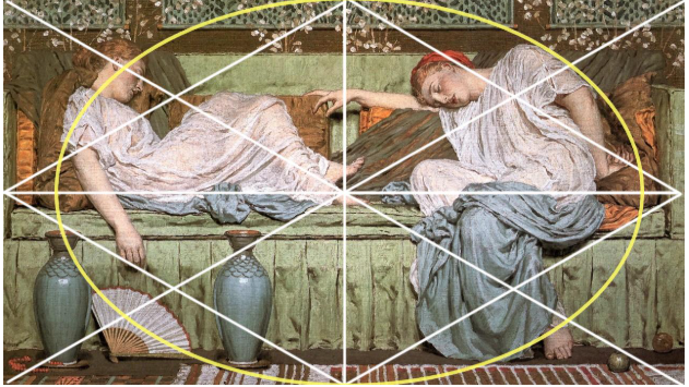 If we divide the (identical) composition into quarters we discover there’s a circular (well, technically oval) composition at work beneath the surface. We find three main shapes below the mid-point: the grouping of the two vases and fan on the left, balanced against the one larger mass of the loose drapery on the right.