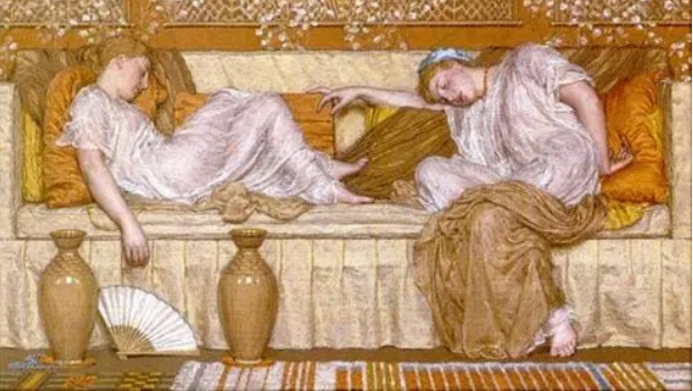 Albert Joseph Moore, “Beads,” ca. 1875, Oil on canvas, 11.5 x 20 in. (29 x 51 cm.)