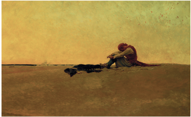 The high horizon line pushes the figure back, away from the viewer, stranding him between the two slabs of near-equal blank linear space. The flat sky presses overbearingly down. The color suggests a parched, waterless heat. The figure slumps forward; his withdrawal into himself contrasts with the awful expansiveness around him, turning the sense of isolation up to 11.