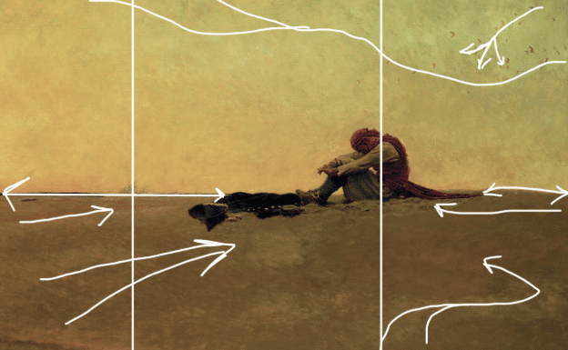 Unrelieved by verticals, the horizon line just slides back and forth, suggesting the feeling of abandonment and isolation, while minimal diagonals at the corners work to point us in and toward the figure.