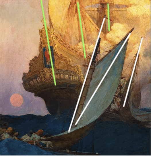 It’s not immediately apparent, but there are two marauding boats here. One (the left) waits to board as the other’s partially hidden crew attacks. Pyle has used design to enhance the drama by tilting the masts of the ornate galleon to the left (green lines) and skewing the masts of the scrappy pirate vessels to the right (white lines). The crowded and opposing verticals expresses a tremendous amount of tension, and the conflict is heightened by the simple broadsail crossing in front of the fancy ship’s stern.