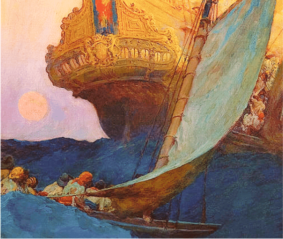 Pyle’s “Attack on a Galleon” (above the Schoonover image) packs visual punch because of the composition, which also expresses the content and enhances the underlying narrative. In this work, a richly appointed ship is beset by a band of pirates (also wearing red bandanas, like our man in “Marooned.”) A ship like this would have been carrying the plundered wealth of the “New World” to the Spanish crown in the 17th century. Such ships were often attacked.