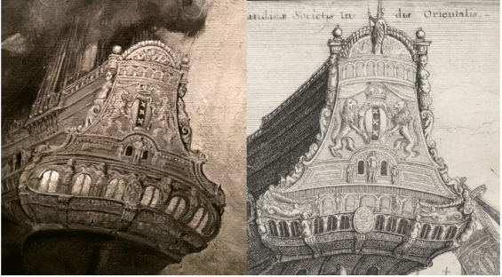 As maritime historian Benerson Little points out, the details of Pyle’s burning galleon match up pretty closely to those in a woodcut by the 17th century Dutch artist Wenceslaus Hollar showing the stern of a Dutch East Indiaman trading ship – just the sort of thing for piratical shenanigans.