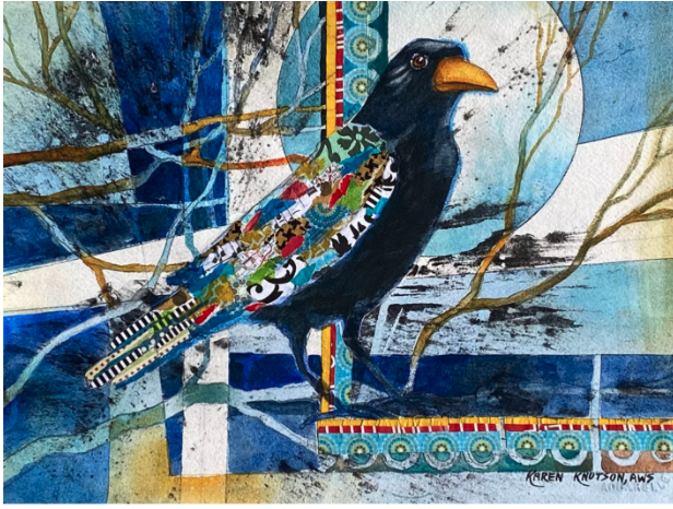 Karen Knutson, “Ready to Fly with Style,” 10.5″ x 14,” Watercolor, collage, charcoal powder