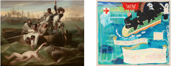 Showing Watson and the Shark by John Singleton Copley side by side with the two paintings Great America and Voyager by Kerry James Marshall illuminates how both artists—centuries apart—reimagined the practice of large-scale, multi-figure history painting in their own time.