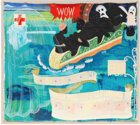 The comparison between Watson and the Black sailor initiates a powerful dialogue with Marshall’s Voyager—a representation of The Wanderer, the penultimate slave ship to land on US shores (illegally) in 1858—and Great America, his depiction of contemporary African Americans on the Middle Passage surrounded by ghosts and a man overboard in an amusement park Tunnel of Love. In that painting, the word “FUN” has literally been whited out. A sign showing the word “Wow” which at first appears to be dripping blood, turns out to be radiating, like fireworks, red streaming stars.