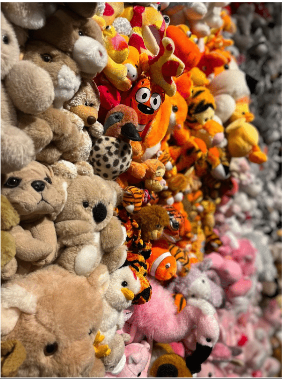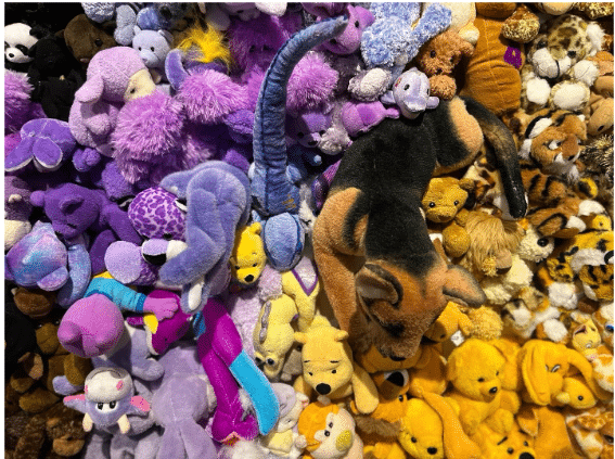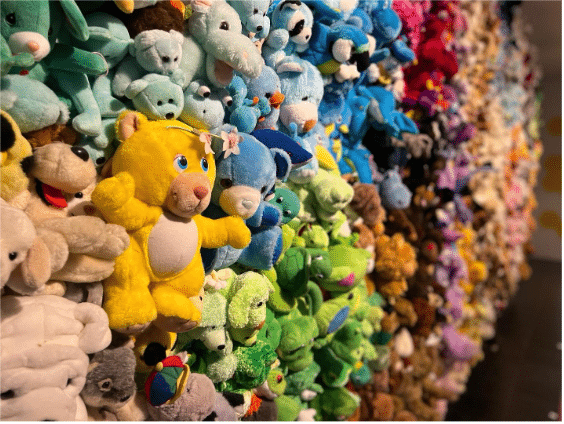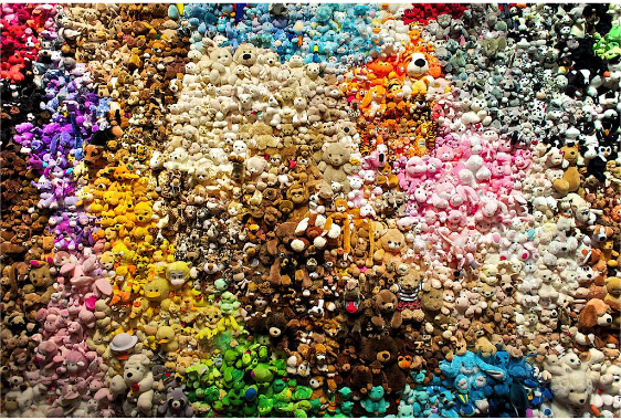 This is the kind of work you want to get up close to, maybe reach out and touch when no one’s looking. From across the museum gallery, it reads like a perfectly normal colorful abstract painting. It’s composed, however, of 3,000 cute and cuddly plushies.