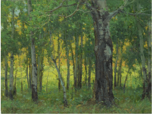 Clyde Aspevig, “Aspen Grove,” oil, 12 in. x 16 in. Clyde Aspevig teaches his unique oil painting approach and technique in his video, ASPEVIG
