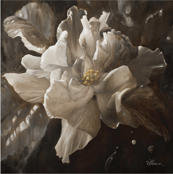 Asked about her general approach to composition, Herrera replies: “For a painting to be successful, you have to find a way to grab viewers’ attention. And you must invite them to participate — to keep them interested in discovering what else is going on in the image.” She continues, “In 2006, when I painted my first botanical, I decided to arrest viewers with the canvas’s large size [72 x 72 inches] and with its lack of color. By using only neutral grays, I would let the viewer decide what color the flower could be.” That painting turned out to be “a showstopper,” so Herrera has been painting hibiscus flowers ever since. (“Metamorphosis” is illustrated below.) In a way, her botanicals are like portraits, and some collectors have noted they look like “angels or ballerinas.”