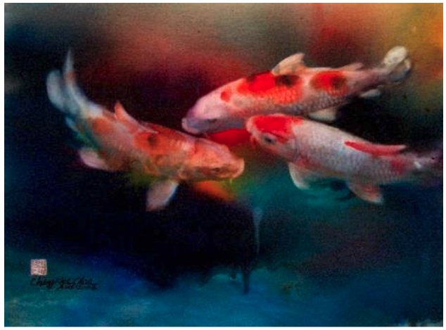 By employing vibrant splashes of color in his compositions (see painting above), Chee’s work transcends the boundaries of traditional watercolor painting, breathing life and energy into his finished work.