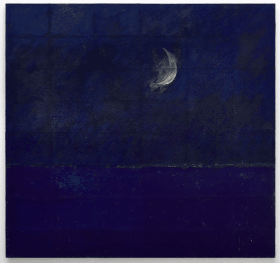 Senza titolo [Luna] / Untitled [Moon], 1979, Wax water tempera, egg tempera and oil on cardboard pieces glued on wood, 74″ x 78″