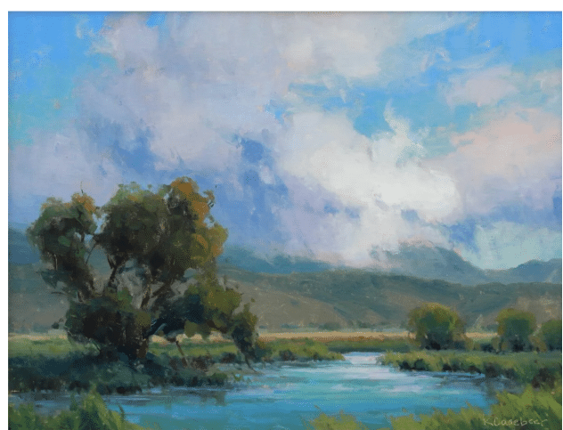 Even though Cindy Baron in the below example uses her clouds to emphasize her painting’s point of interest and to enhance the overall perspective, you can tell the wind is blowing from left to right – all the clouds drift (get pulled) or trail off in the same direction (right in this case).