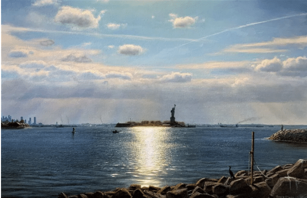 Here’s an example that shows how that plays out. In Port of Entry, above, Joseph McGurl balances long and short cloud shapes in the sky with long and short shapes in the rocks and land masses below. When it comes to rendering a single one solid horizontal band of cloud stretching all the way across, he is careful to raise the edges on both sides so as to form a subtle “V” shape, both sides of which “point” inward, toward the middle of the composition, where the Statue of Liberty forms the main point of interest (the painting isn’t titled “Port of Entry” for nothing).