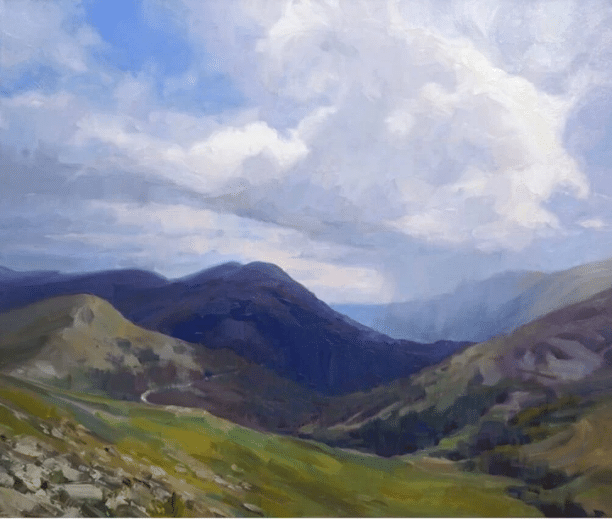 Kathleen Hudson uses her clouds as structural elements in the composition. She makes the main cloud mass on the right taper down like a funnel, with directional reinforcement from the strong diagonal cloud shadow that slides into it from the left side of the canvas. Both shapes converge over the distant area of mountains in atmospheric perspective, where we’re treated to a surprise: rain falling in the distance.