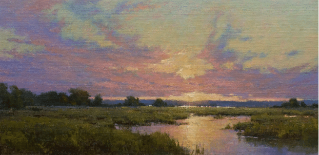 As noted, not just individual clouds but entire skies follow the rules of perspective too. In the painting we looked at by Cindy Baron (see example #3 above) the clouds enhance the illusion of perspectival space, with all the lines converging at the point of the setting sun, which “just happens” to be going down at an ideal point of division around which the whole rest of the landscape is laid out in balanced perspectival proportion.