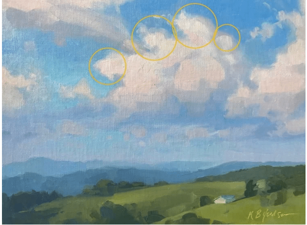 If your clouds are cumulous, treat the puffs like spheres, which means they should have a highlight and a shadow side. Note in the cloudscape by Katherine Hudson below that the highlight (where the sunlight beams onto the curved edges) appears not flush with the edge (too predictable) but near it, with the clouds’ rounded edges getting less light as their surfaces curve away from the viewer (see the yellow circles in the image below).