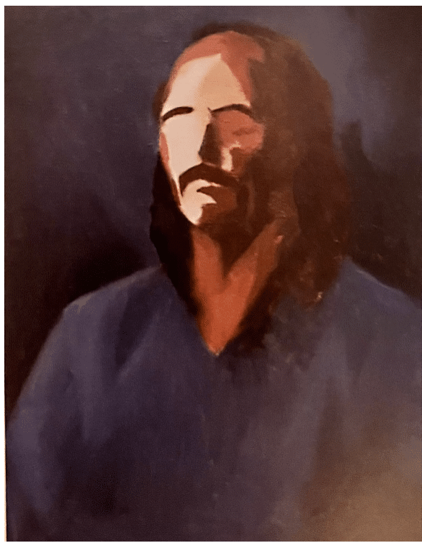 As in many a portrait painting since the Mona Lisa, the basic composition is a three-quarter view in the shape of a pyramid. Elliott fills the space of the canvas with the subject, neither too big or too small, placing the chin just above dead center with the majority of the three-quarter view almost filling the top right quadrant.