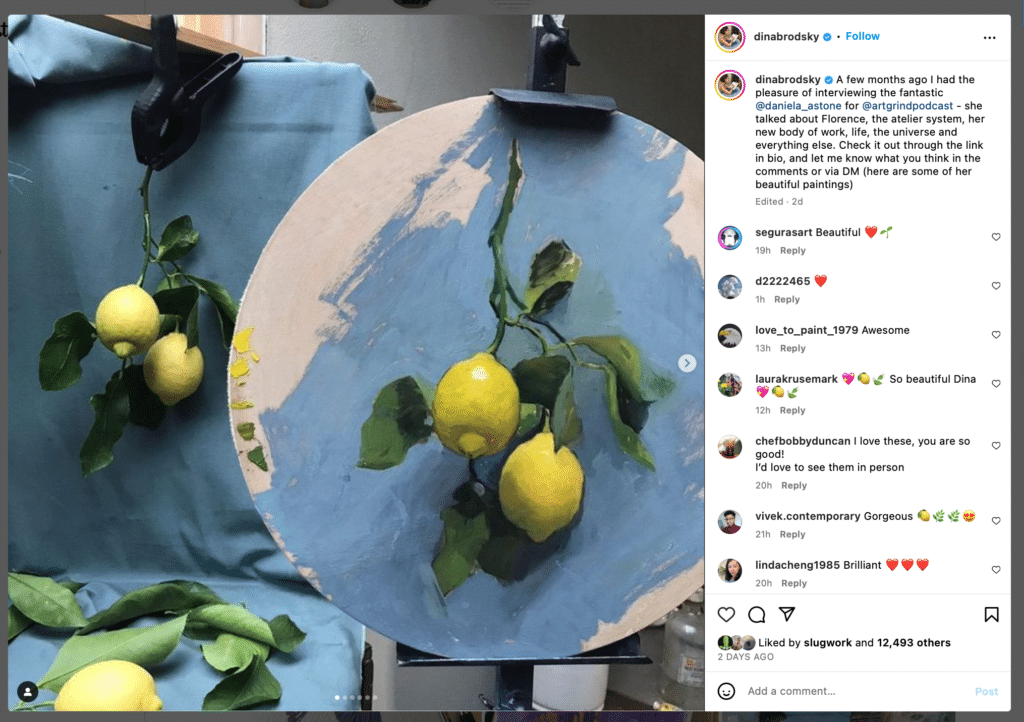 Make your posts in vertical/square format. This is one of the easiest tweaks to make to boost your engagement – if you are painting in landscape format, put the painting up on an easel or your studio wall and photograph it in square or portrait mode, showing a bit of context around it. This will also show your audience how big the painting is.