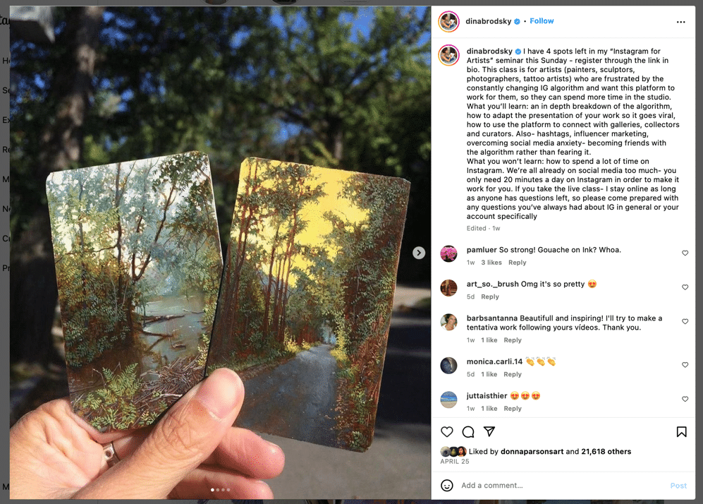 Dina Brodsky is a full-time artist and social media influencer. She offers Instagram for Artists, an online course that helps artists “win Instagram” at their own pace. In Part 2 of her two-part series for Inside Art, Dina covers the specifics of selling your work on Instagram and how (and how not) to promote a studio sale, workshop, or gallery exhibition on Instagram. Dina also offers a free guide for artists to troubleshoot their lnstagram account that breaks down some common problems and offers solutions. Download it here.