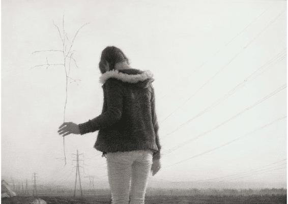 Julio Reyes, “Outland,” charcoal on paper, 20 x 28.5 in.
