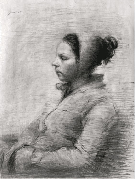 There are many good and practical techniques for checking the strength of the picture’s design, and I use them often throughout the creation of a drawing. Squinting helps me to see the basic shapes of light and dark to assess the accuracy of their relation to one another. Sometimes, viewing the work in a mirror is helpful in spotting structural errors as well as revealing negative shapes that I might not have seen before. Also, looking at the piece from across the room, upside down or in different light can give new information to me. I am always trying to be sensitive to how the values and basic shapes might look in any circumstance.