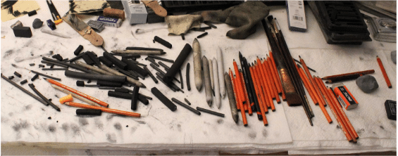 Working in graphite requires graphite pencils in varying degrees of hardness, a mechanical pencil, and graphite sticks (in densities varying from 2H to 8B). I’ll occasionally heighten darks in a drawing with a lithographic crayon. To erase graphite, I’ll use kneaded erasers and some drafting-type erasers. Different values and textures are also attainable with paper stumps (smudge sticks) and clean and/or dirty chamois. The paper I use for graphite drawings has traditionally been Bristol board; however, I’m always looking to try different things with interesting surfaces.