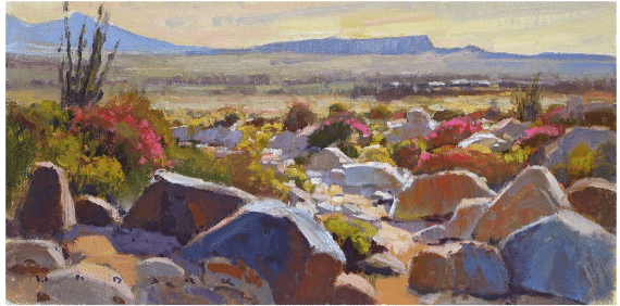 By contrast, the artist painted the smaller “Bouncing Light” during the Anza-Borrego Desert State Park plein air invitational event, where he observed and recorded the effects of the intense Southern California desert light firsthand. The rim lighting on the backlit boulders of the arroyo fascinated the artist, as did the reflected light bouncing onto the facing sides of the rocks from the backs of those in front of them. Desert wildflowers added contrast and beauty to the elongated scene.