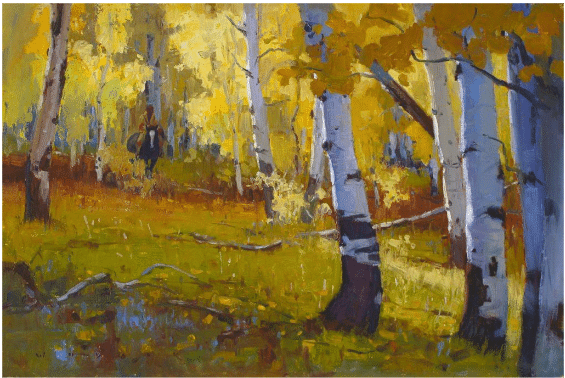 The massing of leaf shapes and the enchanting colors in “The Golden Blanket” superbly reveal the power and clarity of the artist’s voice. Again, Wodark varies the shapes, colors, and sizes of the aspen trunks and branches and the spaces between them. “This is definitely one where I felt adding a rider was essential. To see what I mean, take your hand and block out the figure and horse,” he suggests. “Everything leads you to that spot, so I needed something there to reward your eye. I didn’t put highlights on the rider because I didn’t want you to see him at first, but rather to discover him emerging from the aspen grove.”