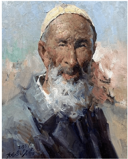Jove Wang, The Old Man in the White Scarf, oil on linen