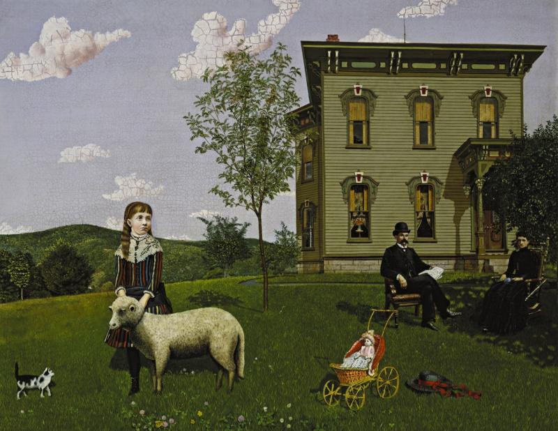 The little girl gazing dreamily beyond the borders of the picture is the artist’s daughter Effie, who died of appendicitis when she was nine. Here she stands with her pet lamb and kitten, with the artist and his wife dressed for mourning tucked into the background; half in sun and half in shadow, the two seated figures appear rigid and diminished against the clapboard house Elmer built in Western Massachusetts. Everything looks pasted on, as if from a child’s set of cut-out paper dolls or a painting by Magritte.